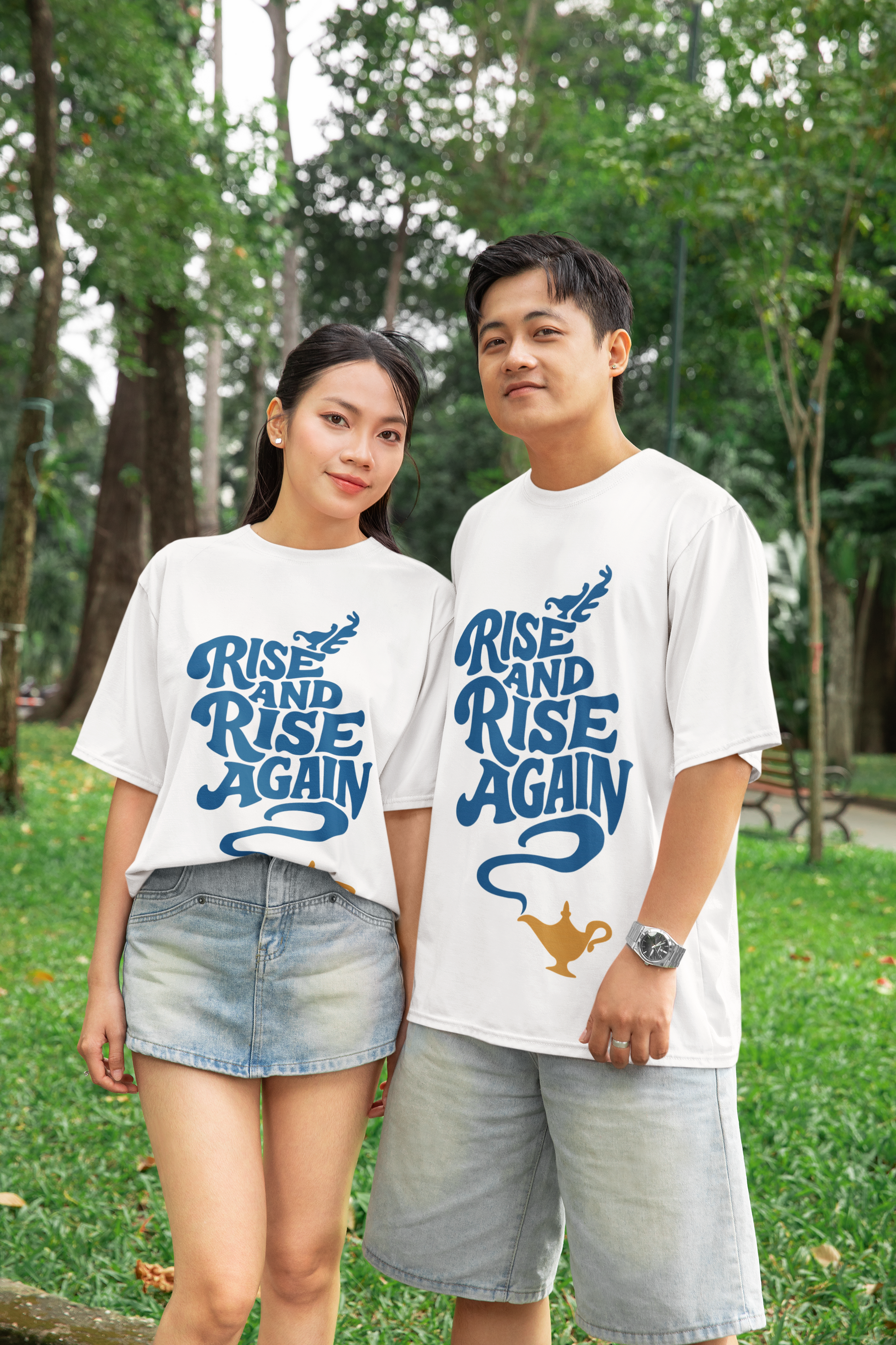 Embrace resilience and positivity with the Rise and Rise Again Oversized T-Shirt. Featuring a bold blue motivational typography with a magical golden lamp detail, this unisex tee inspires strength and determination. Perfect for those who believe in bouncing back stronger every time.