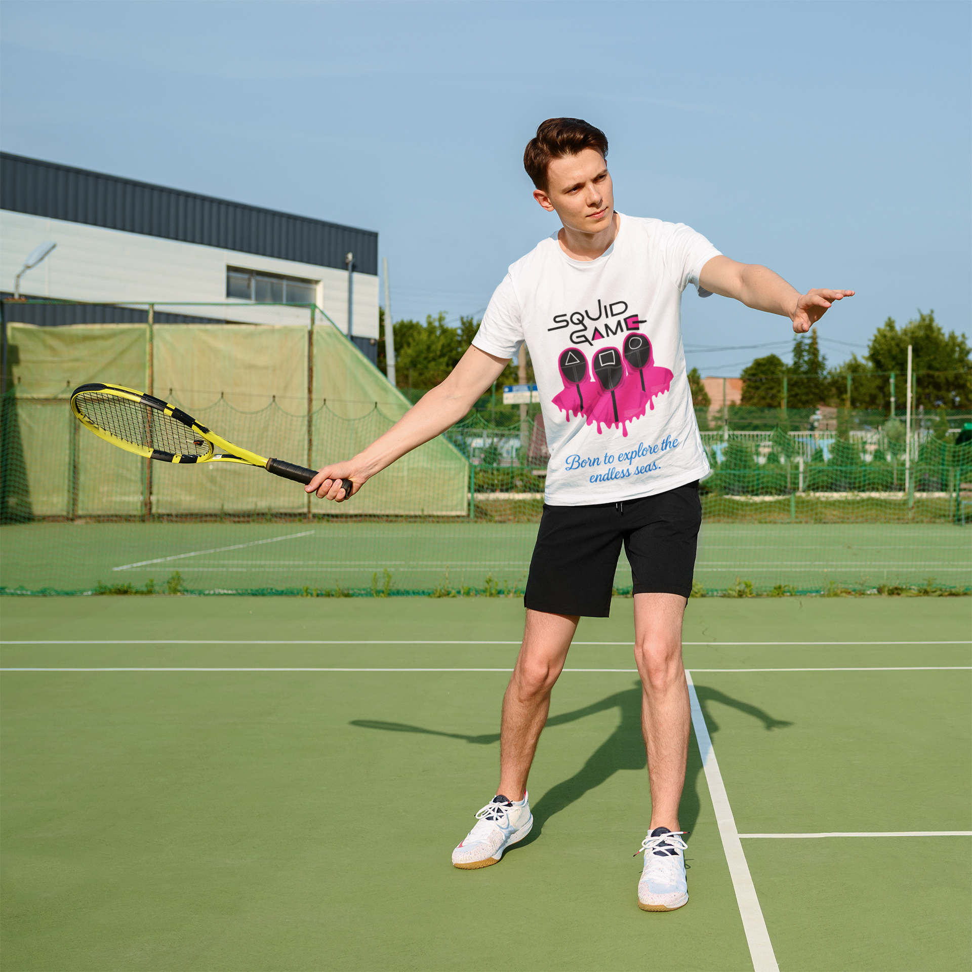 The Squid Game Inspired Graphic T-Shirt is perfect for fans of the hit series and lovers of bold, pop-culture fashion. Featuring the iconic masked guards with circle, triangle, and square symbols over a vivid pink backdrop, paired with the quote “Born to explore the endless seas”, this tee blends mystery, style, and adventurous spirit in one striking design.